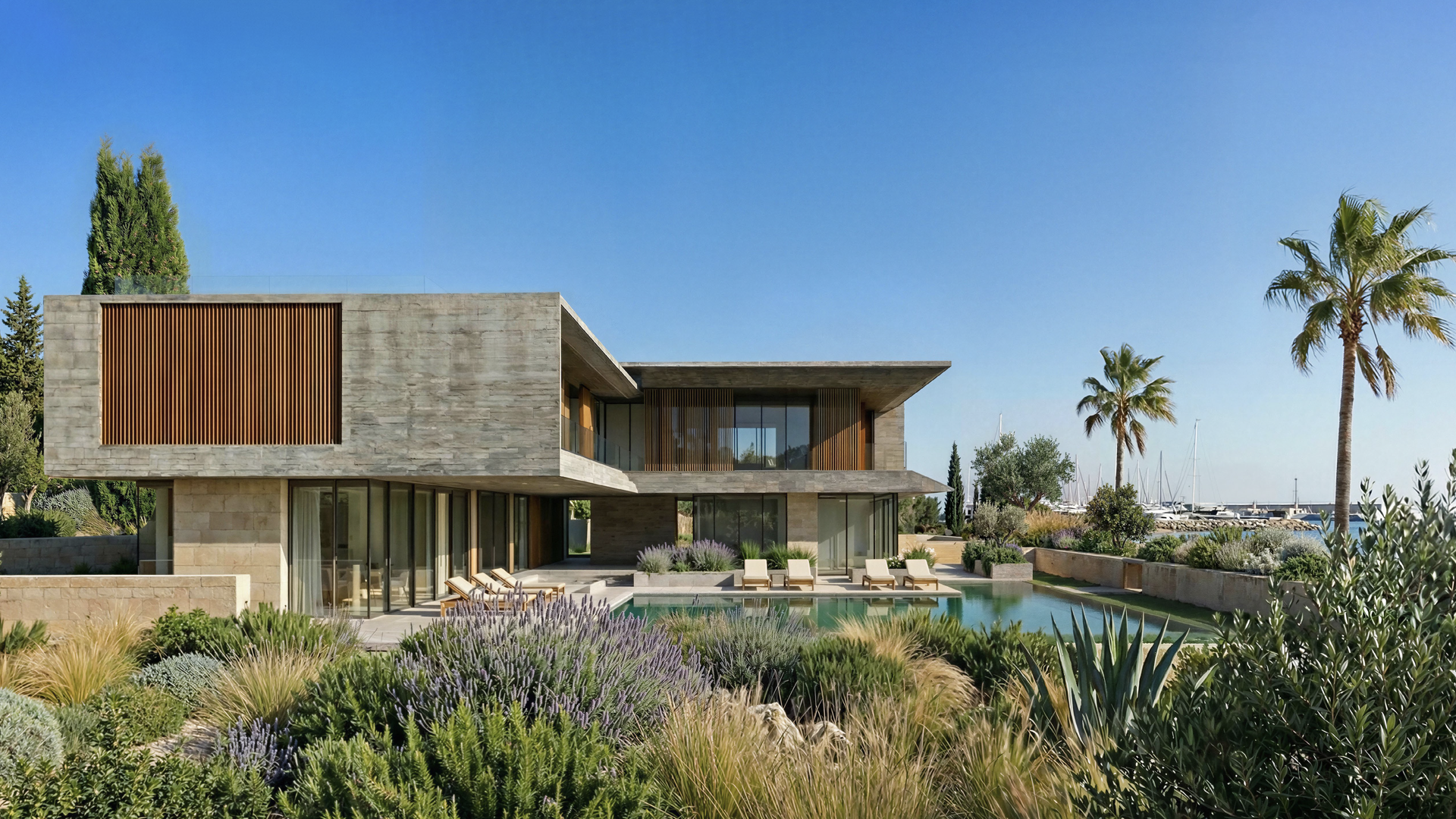 Signature Architecture: High-end design blending hand-laid stone masonry and timber louvers with floor-to-ceiling thermal glazing.